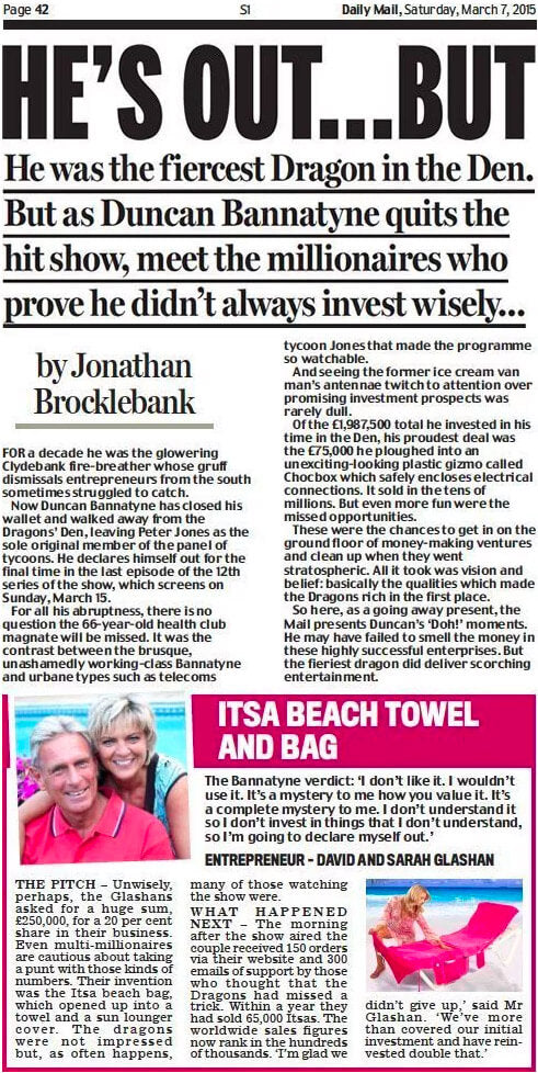 Unwisely, perhaps, the Glashans asked for a huge sum, £250,000 for a 20 percent share in their business. Even multi-millionaires are cautious about taking a punt with those kinds of numbers. Their invention was the Itsa beach bag, which opened up into a towel and sun lounger cover. The Dragons were not impressed but, as often happens, many of those watching the show were!